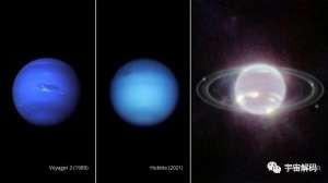 “旅行者”探测器于1989年(左)、哈勃望远镜于2021年(中)和韦布望远镜于2022年(右)拍摄的海王星照片(美联社) 哈梅尔说,在韦布望远镜之前,天文学家从未清晰地观测到海王星的星环系统